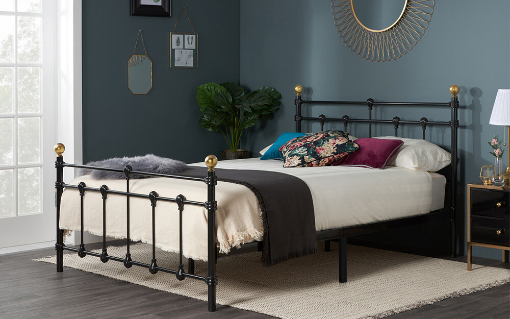 The Birlea Atlas Metal Bed Frame uniquely captures an elegant traditional design at an affordable price. Manufactured from durable steel material, this bed frame is brilliantly sturdy and reliable. So you can rest easy knowing you are being fully supported. Available in both a black or cream finish, you can choose whichever suits your style most. The neutral colours are protected with a layer of epoxy paint to limit any chipping and stains from damaging the frame. Adding a delicate touch of luxury, this bed frame features stunning brass details. Across the base you will find the supportive addition of sprung slats. Used as a tool for holding your mattress in place, slats ensure stability. Sprung slats are naturally curved for additional bounce that encourages responsive support. Available now at Mattress Online.