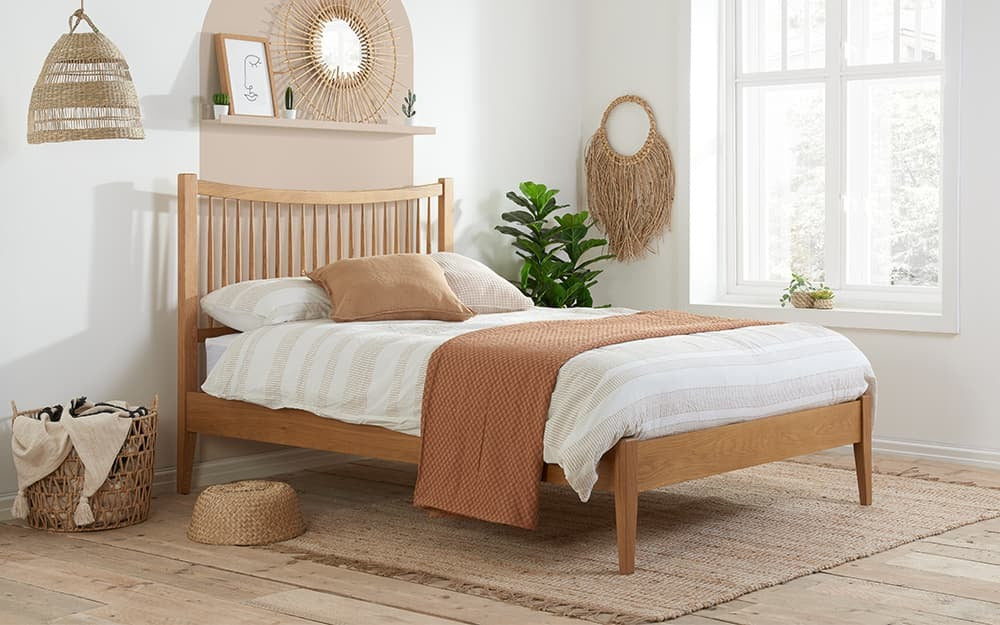 Add a classy and inviting look to your bedroom with the Birlea Berwick Bed Frame. Its solid oak and plywood frame has a charming look to perfectly fit into your bedroom. This is complimented by the traditional spindle headboard design with its parallel spokes, for an overall welcoming feel. The low footend opens up the space of your room and allows you to comfortably stretch out. The solid slat construction forms a sturdy and reliable base for your mattress, creating a slight sense of additional firmness to your bed. Complete with a 1 Year Warranty.