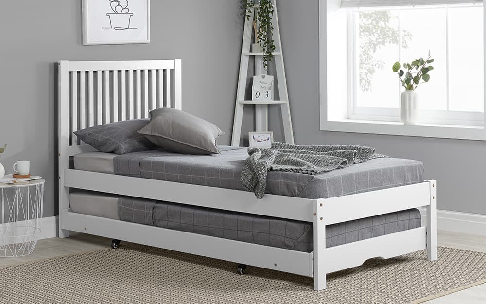 The Birlea Buxton Trundle Bed Frame is perfect for a teenagers room or your guest room. Crafted out of eco-friendly rubberwood, the bed frame is both attractive and made from renewable and sustainable material. A high, slatted headboard and low foot end present a classic profile that conceals the trundle bed. Casters aid the easy pull-out and lift mechanism that transforms your compact single bed into either two side-by-side singles or a double suitable for couples in your guest room. Frame and trundle have solid slatted bases providing firm, reliable support. Slats also promote airflow keeping your mattress fresher for longer.