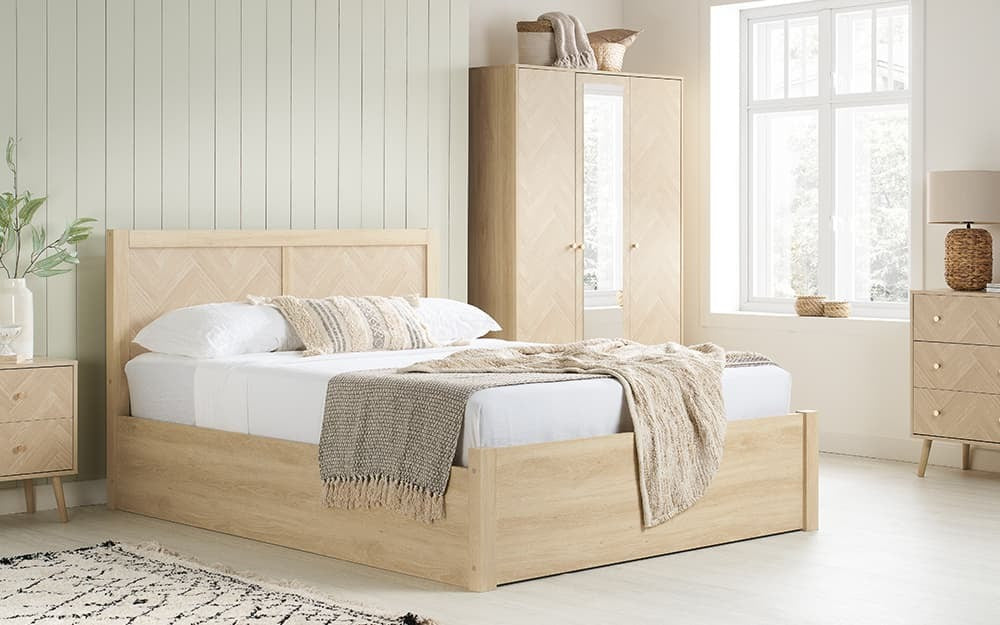The Birlea Herringford Wooden Ottoman Bed Frame is constructed from high-quality particleboard, finished with a laminated oak effect that captures the appeal of natural wood. The Herringford marries functionality with contemporary elegance. The headboard provides the perfect centrepiece for your room with an elegant herringbone pattern. This frame also features a clever space-saving solution with its ottoman design, the bed's base lifts effortlessly to reveal a substantial storage compartment perfect for keeping your sleeping space neat and tidy. Durably designed with an inner metal frame and centre rail, this bed frame has a maximum weight load of 350kg. It comes with a 1 Year Warranty.