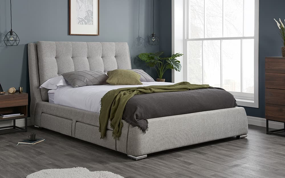 Pairing a modern design with handy storage space, the Birlea Mayfair Fabric Bed Frame is a perfect option for your bedroom. Upholstered in a stunning grey fabric for a neutral look to complement any room. The headboard has a cushioned look, inviting you to curl up in this bed for a night of comfortable rest. Button detailing adds a touch of interest, completing the look. Curved sprung slats soften the feel of your bed for a touch of extra cosiness. The four drawers are ideal for tucking away spare bedding or anything else taking up space.1 Year Warranty.