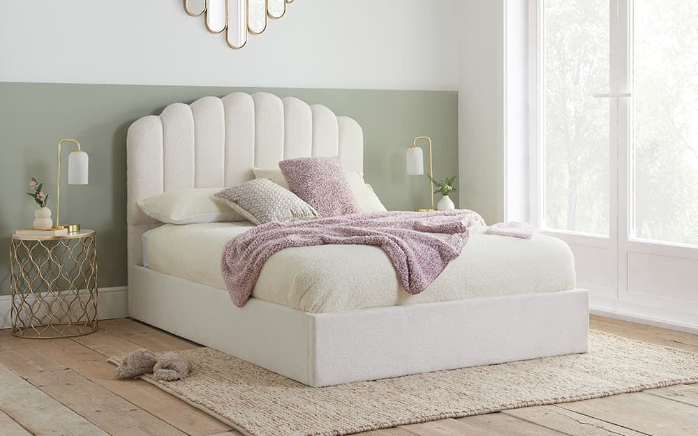 The Birlea Monaco Fabric Ottoman Bed Frame features a modern scalloped headboard design. The bed frame is wrapped in a white boucle upholstery, perfect for lounging and relaxing in bed. The frame is constructed from sturdy particleboard and has wooden sprung slats that offer natural bounce for extra comfort. The Monaco has a clever space-saving design. Gas pistons help the base lift effortlessly to reveal a substantial storage compartment. The maximum weight load for the 4'6 frame is 300 kg, and the 5' frame is 400 kg. 1 Year Warranty included.