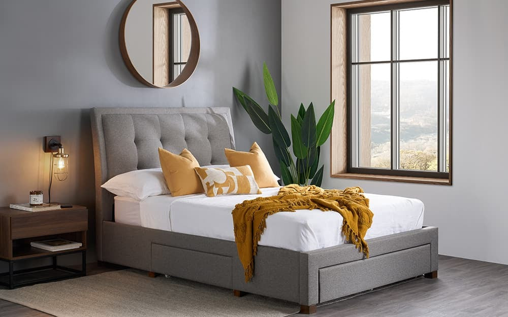 The Birlea Shelby Fabric Bed Frame combines style and function.This modern frame conceals three handy storage drawers, easily accessible using their smooth gliding castors. The Shelby is upholstered in a beautiful soft grey fabric. It features a plush deep-buttoned headboard perfect as a backrest for nighttime reading. A low footend gives the appearance of extra space, a great choice for smaller rooms. A sprung slatted base provides extra bounce, adjusting to pressure and working with your mattress to provide responsive support. The maximum weight load for the double bed is 400kg and the king is 450kg. 1 Year Warranty.