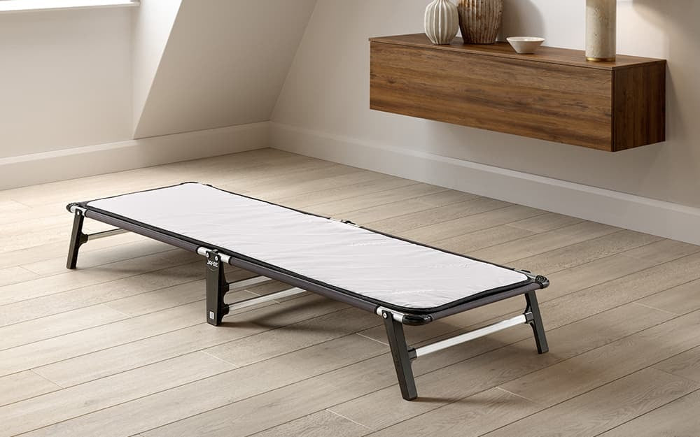 The Jay-Be Lite Folding Bed with e-Fibre™ Insulator Pad is your one stop solution for sleepovers, guests and camping. Constructed from durable steel, this frame is exceptionally sturdy. Holding you or your guest in secure comfort all night long. Equipped with J-Grip™ Anti-Tip legs, there is a 6-point contact base. This enhances the stability of the bed, making sure it does not waver when in use. Laying flat on top of this base is the Mono-Tex™ platform base. It is designed to provide a supportive resting place for the specialised e-Fibre™ Insulator pad. Made from recycled materials, this layer is foam-free and amazingly breathable. Creating a soft and cosy sleeping surface. Free from harmful chemicals and designed with hypoallergenic materials, you can rest assured your healthy and comfort is Jay-Be's priority. Available now at Mattress Online.