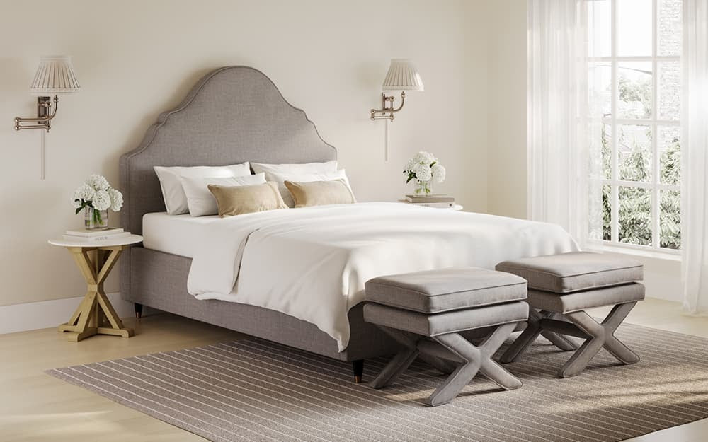 Create a beautiful focal point within your room with the LPD Quince Fabric Bed Frame.The portman headboard really frames the space of your bed with its symmetrical look and eye-catching curves. It's upholstered in a linen blend fabric that offers a cosy feel, in an appealing grey finish that offers a modern look. Incorporating sprung slats into the construction of this bed frame also adds a tad more support, softening the feel of your mattress for comfortable rest. This is then placed upon the reliable wooden frame of this bed for an all around supportive sleep. 1 Year Guarantee.