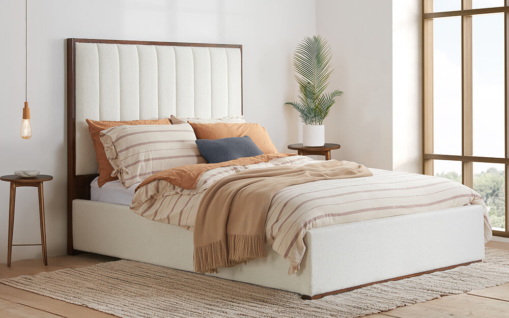 Enjoy the fine luxuries this Novo Annabelle Fabric Bed Frame offers. Constructed with a rich, dark brown wood frame and wrapped in a soft white boucle fabric. The headboard creates an understated sense of luxury with its wooden and boucle design. It features a fluted headboard that provides soft comfort for lounging. With solid wooden slats, this frame creates a strong and supportive base to your mattress, providing you with a firmer feeling mattress. Made from strong, durable material, this bed frame has a long-lasting performance. Finished with a 1 Year Guarantee.
