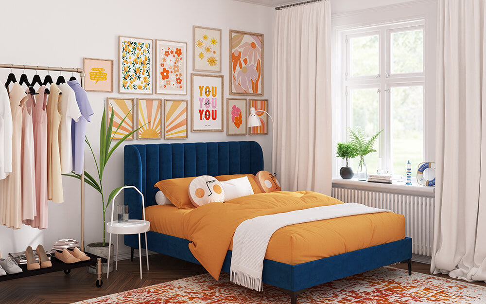 Enhance your bedroom decor with the Novo Annie Fabric Bed Frame. In neutral Steel Grey Velvet or Off White Woven fabric choices, or a funky Blue Velvet for a touch of colour. Create a stunning focal point in your room with the beautiful fluted design, accentuated by winged headboard sides. A handmade wooden frame holds sprung slats. These gently cradle you and your mattress for a more supportive sleep. Encourages air to flow through your mattress for a fresher sleep. Minimal assembly required; you can relax back in no time, as soon as tomorrow with free next day delivery. Available at Mattress Online.