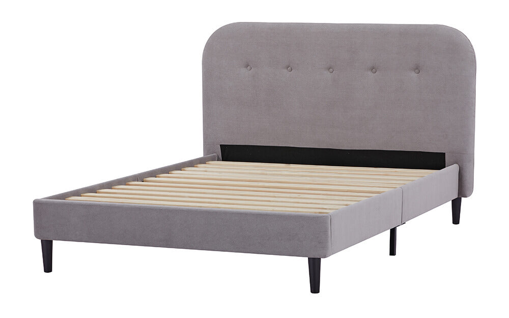 Luxurious, modern bed frame without the heavy price tag! The Novo Levi Fabric Bed Frame is constructed with a sturdy pine wood frame that has been skillfully hand made. With a minimalist design, the headboard features a tufted line of button detailing. Soft padding and the curved corners on the headboard create a cosy sleeping environment. The strong solid slats create a firmer sleeping environment because of its sturdy nature. The slats allow for additional airflow for a breathable, cooler sleep. For easy and handy delivery, this bed frame is delivered all in one box! Each component of the frame is tucked away into the back of the headboard. Topped off with a 1 Year Guarantee.