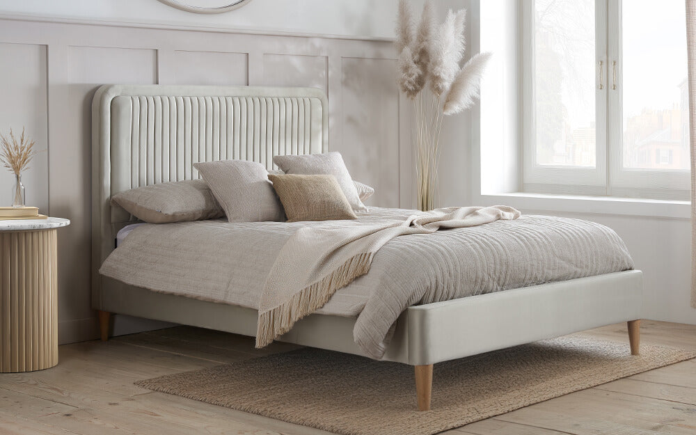 Unwind with the Novo Tallulah Fabric Bed Frame for optimal support night after night. Delicately covered in a soft warm stone velvet fabric. This bed adds a touch of comforting softness that protects your body from the feel of cold and harsh wood. The elegant warm stone colour is wonderfully natural, effortlessly fitting every aesthetic. Designed with a luxurious fluted finish across the headboard, you can lounge in style. Across the core of this bed frame there are well placed solid slats. Secure and durable, these slats hold your mattress in place. Reinforcing the support of your mattress and creating a soothing firm feel. Manufactured from durable material, the entirety of this bed frame is lightweight, making it easier to rearrange placement. Available now at Mattress Online.